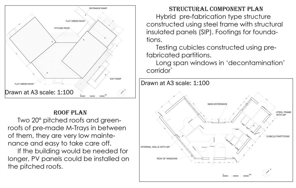 It is intended that the facility would be able to be deployed anywhere in the world and easily assembled. The building can be constructed using any materials, but the medical spaces must be finished internally with medical grade materials. It should be single storey and utilize sustainable technologies where possible.