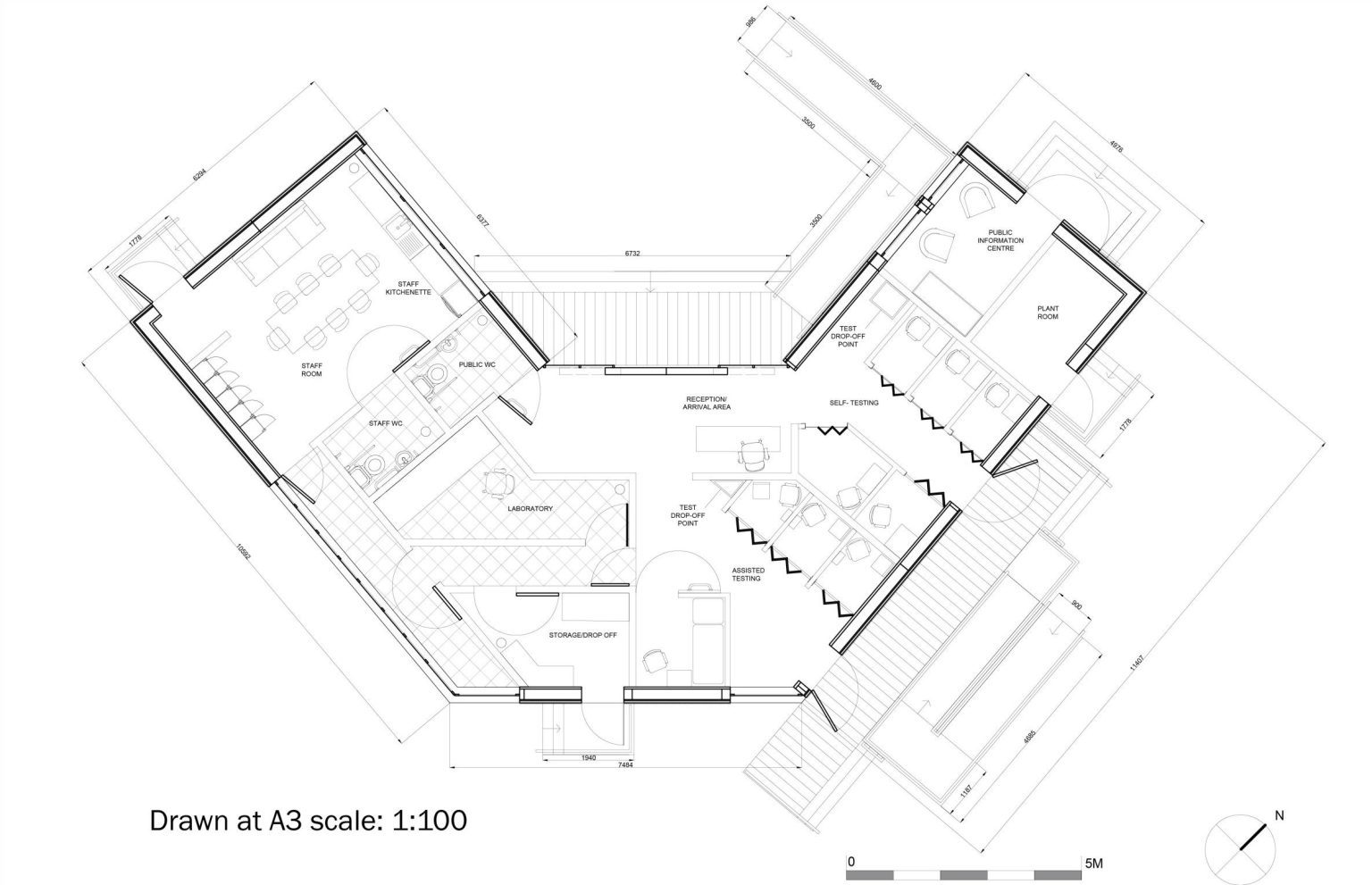 Areas required: • Testing arrival/holding area with WC • Test area (supported and self-given testing) • Medical lab/collation facilities • Collection/storage facility • Public information lounge/reception with WC (separated from testing arrivals) • Staff area with WC/kitchenette • Small plant room